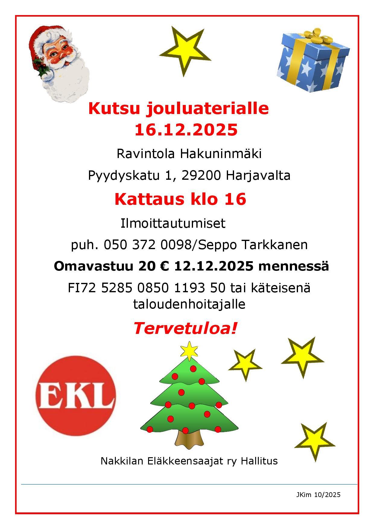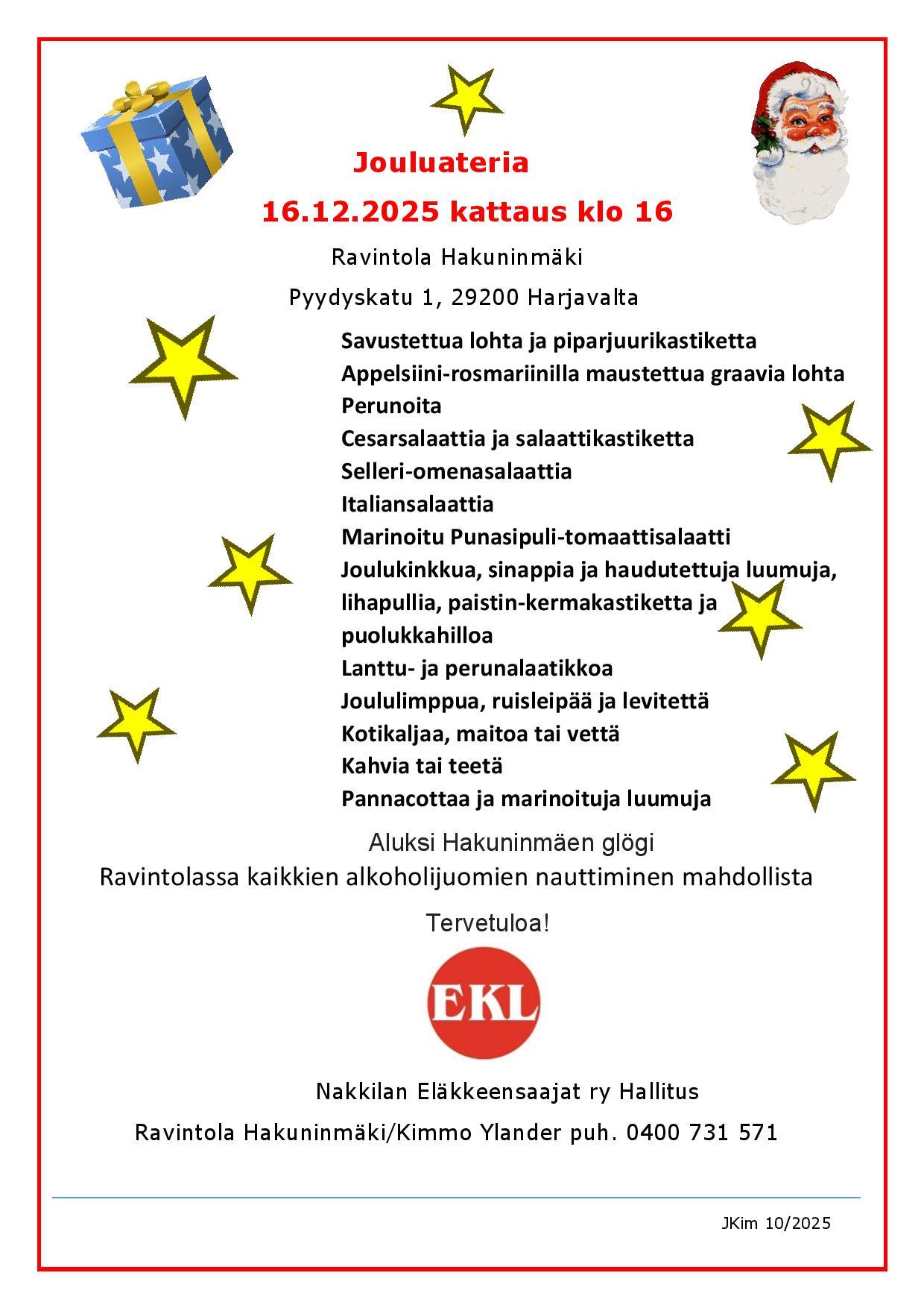 Nakkilan Eläkkeensaajien jouluateria 16.12.2025 klo 16–18 osoitteessa Ravintola Hakuninmäki