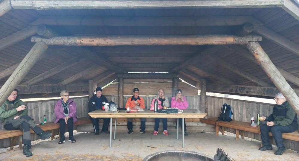 Hetken kuluttua laavulle saapumisen jälkeen, kohti taivasta nousi ylväästi eläkkeensaajien leirinuotion sauhu. Sitä vielä toinen tovi ja ensimmäiset pääsivät paistamaan grillimakkaraa. Laavulla oli hyvä ja sees' tunnelma, puhuttiin asiaa kuinka, liikunta on meidän ikäisille tärkeää ja yhdessä liikkuminen on hauskaa. Pohdittiin sitäkin, kuinka yhdistyksessä ollaan tultu tähän - liikunnasta ja kuntoilusta on muodostunut lähtemätön osa yhdistyksen päivä-, ja viikkorytmiä. Voiko olla paremmin. Näin heitettiin osuva kysymys vastapalloon.