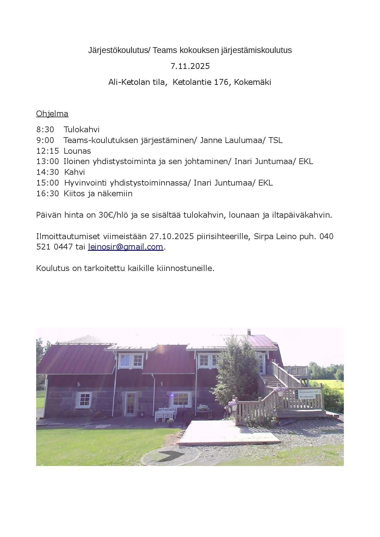 EKLn Satakunnan piirin Järjestökoulutus/Teams kokouksen järjestäminen Ali-Ketolan tilalla Kokemäellä 7.11.2025. Koulutus alkaa klo 8:30 ja päättyy klo 16:30. Koulutuksen hinta 30 €/henkilö, sisältäen…