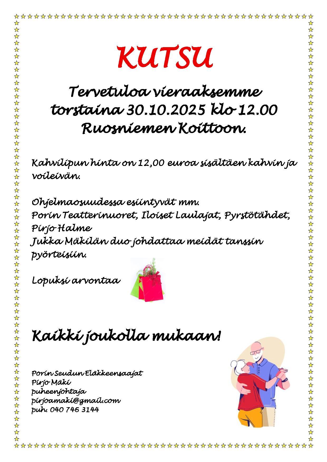 Kahvilipun hinta 12 € sisältäen kahveen ja voileivän. Ohjelmaa esittävät Porin Teatterinuoret, Iloiset laulajat, Pyrstötähdet ja Pirjo Halme. Tanssintahdit takaa Duo Jukka Mäkilä. Tervetuloa!…