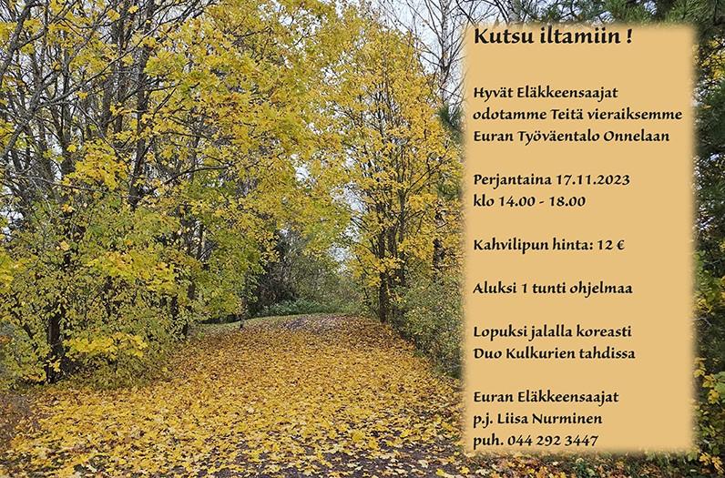 Lisätietoja Euran Eläkkeensaajat puh. 044 292 3447/Liisa Nurminen.