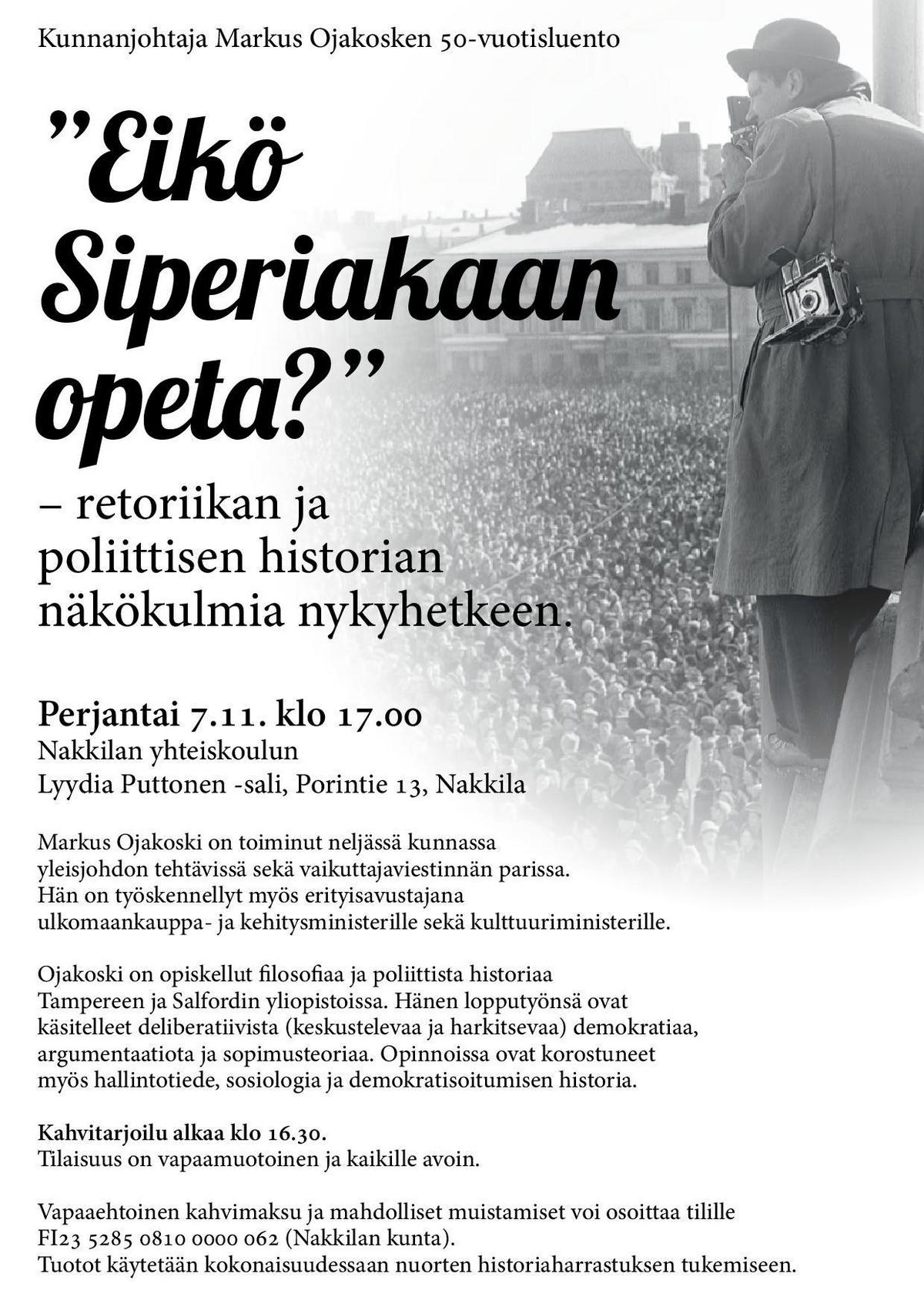 Vapaaehtoinen kahvimaksu ja mahdolliset muistamiset FI23 5285 0810 0000 062 Nakkilan kunta. Kertyneet varat käytetään lyhentämättöminä nuorten historiaharrastuksen tukemiseen.