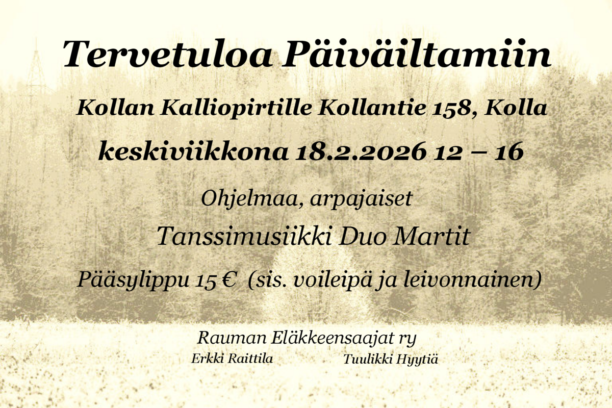 Rauman Eläkkeensaajat ry Päiväiltamat keskiviikkona 18.2.2026 klo 12-16 osoitteessa Kollan Kalliopirtti, Kollantie 158, 26560 Kolla.