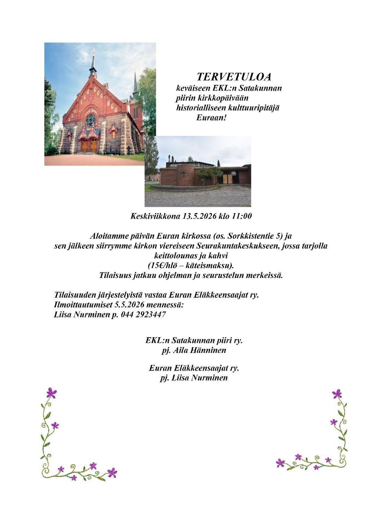 EKLn Satakunnan piirin Kirkkopäivä 13.5.2026 Euran kirkossa osoitteessa Sorkkistentie 5, 27510 Eura.