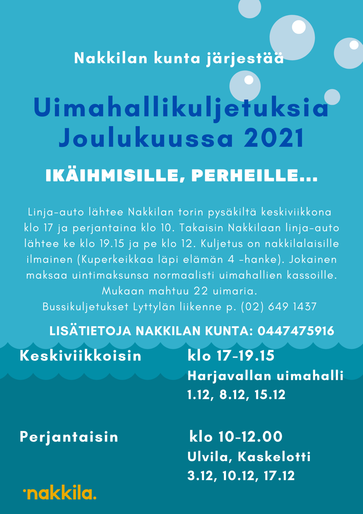 Lähtö klo 17 Nakkilan torilta ja paluu klo 19:15. Kuljetus on ilmainen, maksu uimahllin kassalle vain uintikerrasta.
