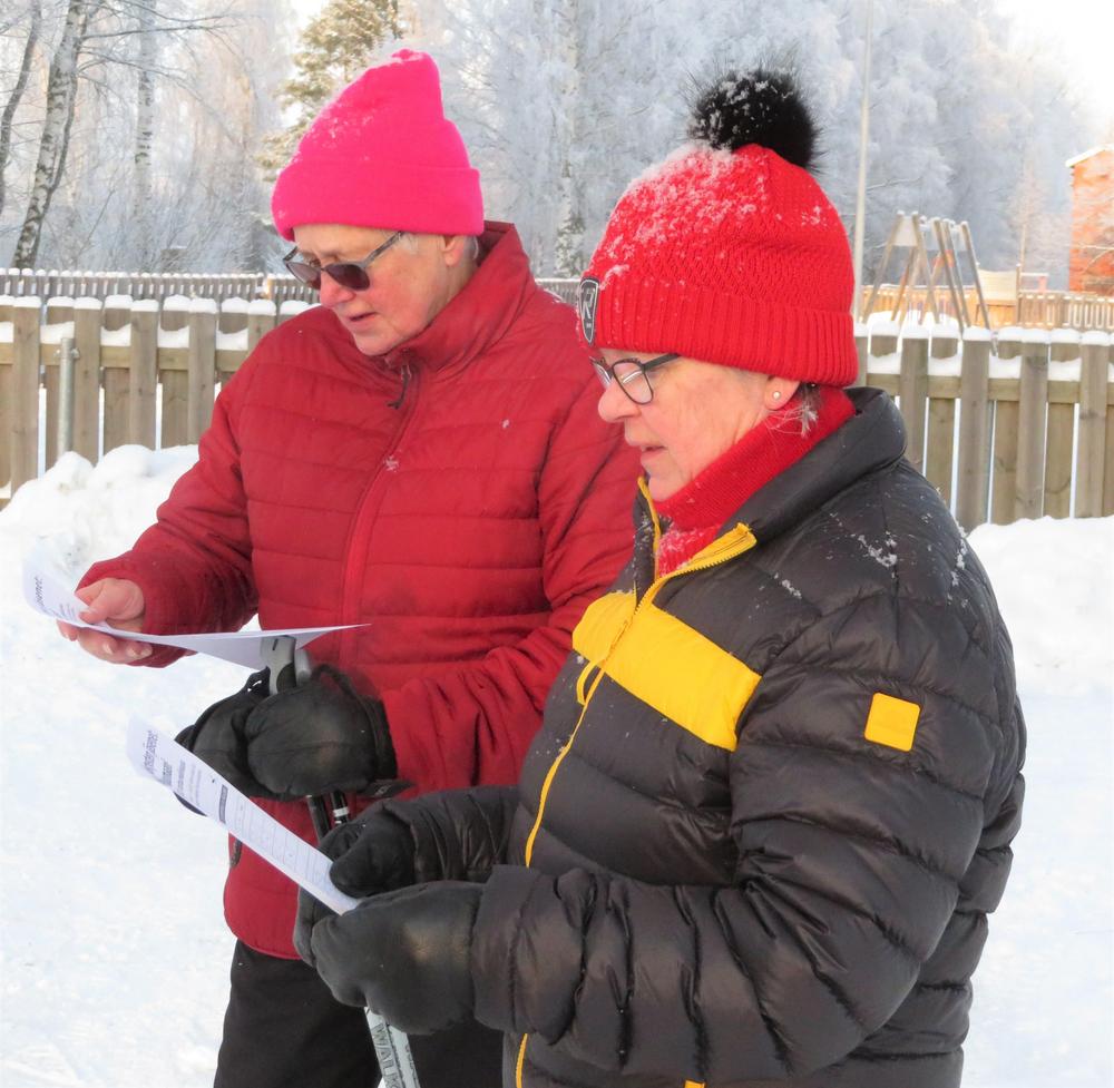 Kirsti Pessi mustassa urhelitakissaan ja Vuokko Laaksonen punaisessta liikuntatakissaan tutustuvat EKL:n Liikuntakamppanjan suorituskorttiin.